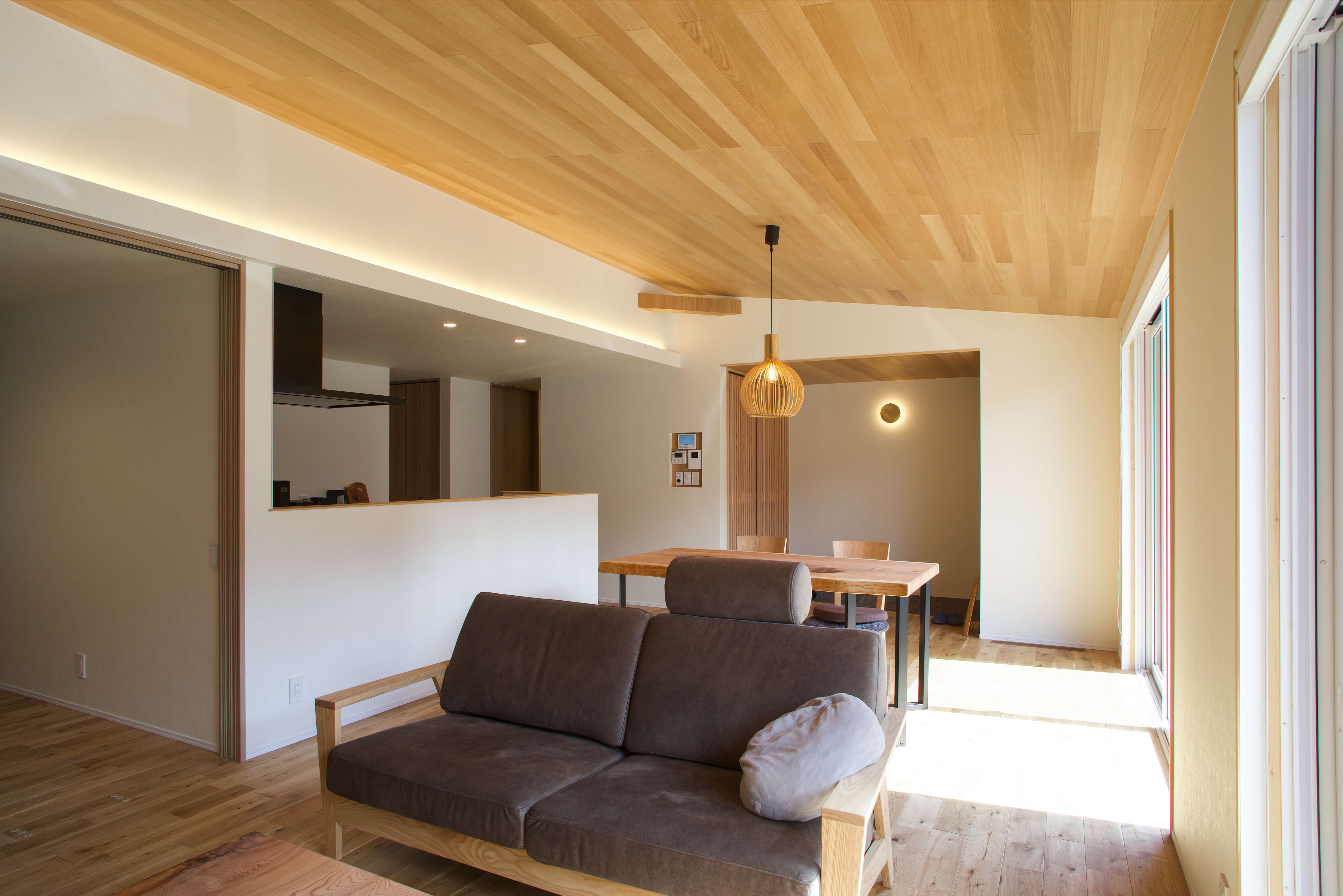 オークの羽目板を貼った勾配天井はリビングにいながらも木の優しい雰囲気に包まれて居心地が◎